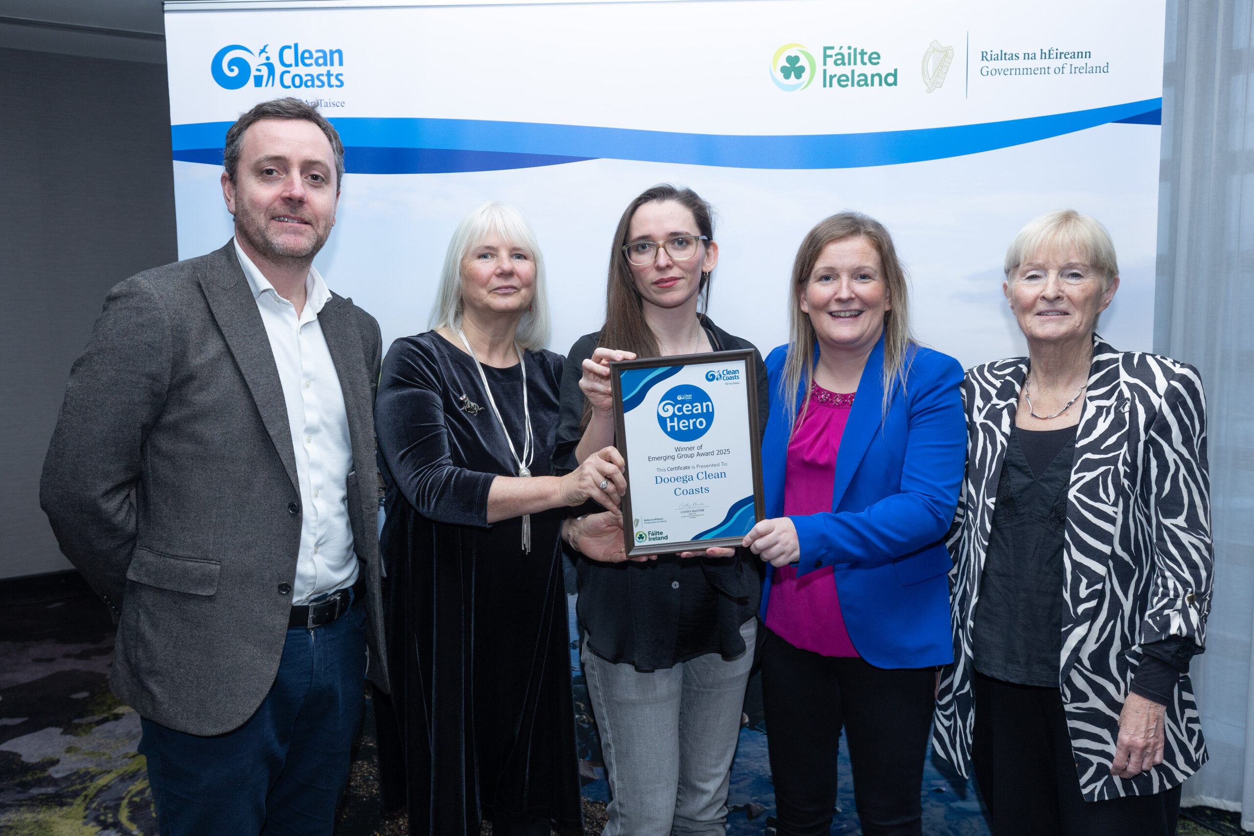Established in 2024 with just 4 volunteers, the Dooega Clean Coasts Group has quickly grown into a vibrant community effort with over 20 active members, welcoming everyone, with volunteers from ages 3 to 83, along with visitors from across Ireland and local Ukrainian neighbours. Working on Dooega’s beautiful coastline, the group has made amazing progress in a short time, in 2025, they took part in themed events such as Love Dooega Beach this Valentines, Go Green for St. Patrick’s Day, Easter Bunny Clean-ups, the Big Beach Clean, carried out 2 minute beach cleans weekly and created an impressive Halloween Scarecrow Trail using items collected during clean-ups. As an island community, they value protecting their coast and take pride in educating all ages about its environment. They also collaborate regularly with Féile Dú Éige to provide refreshments after each clean-up, fostering connection and belonging. The group say, “You never feel bad after a beach clean, there’s always a great sense of achievement, especially when joined by other members of our community.”